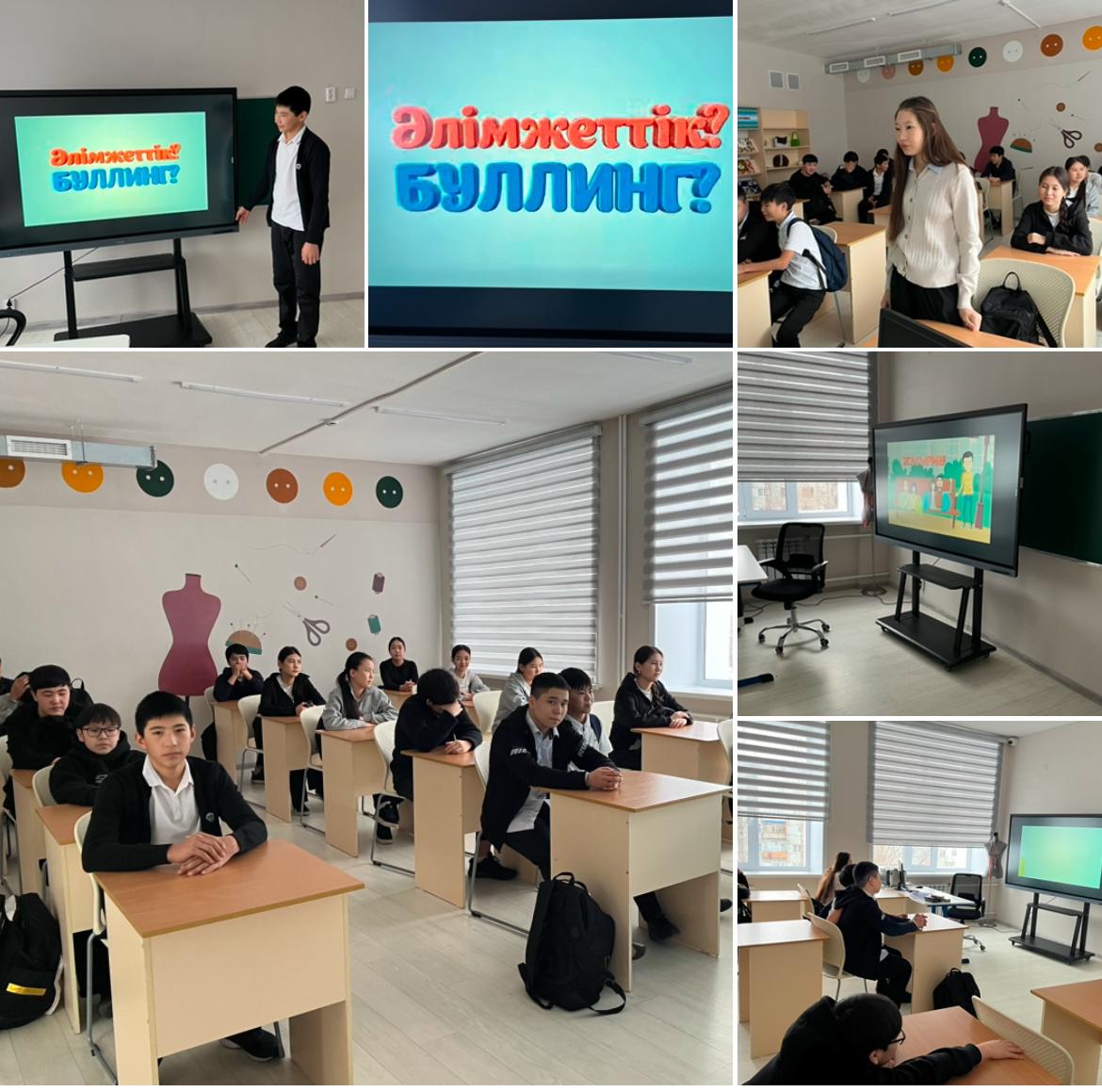 Оқушылар арасында буллингтің алдын алу мақсатында сынып сағатын өткізілді. Сынып сағаты барысында буллингтің түрлері, оның адам психологиясына тигізетін кері әсері және буллингке жол бермеу жолдары туралы түсіндірілді.Оқушыларға бір-біріне құрметпен қарау, өзгелердің пікірін сыйлау, қиын жағдайда қалған адамға қолдау көрсету маңызды екені айтылды. Сонымен қатар түрлі өмірлік жағдайлар мысалға алынып, оқушылар өз ойларымен бөлісті.