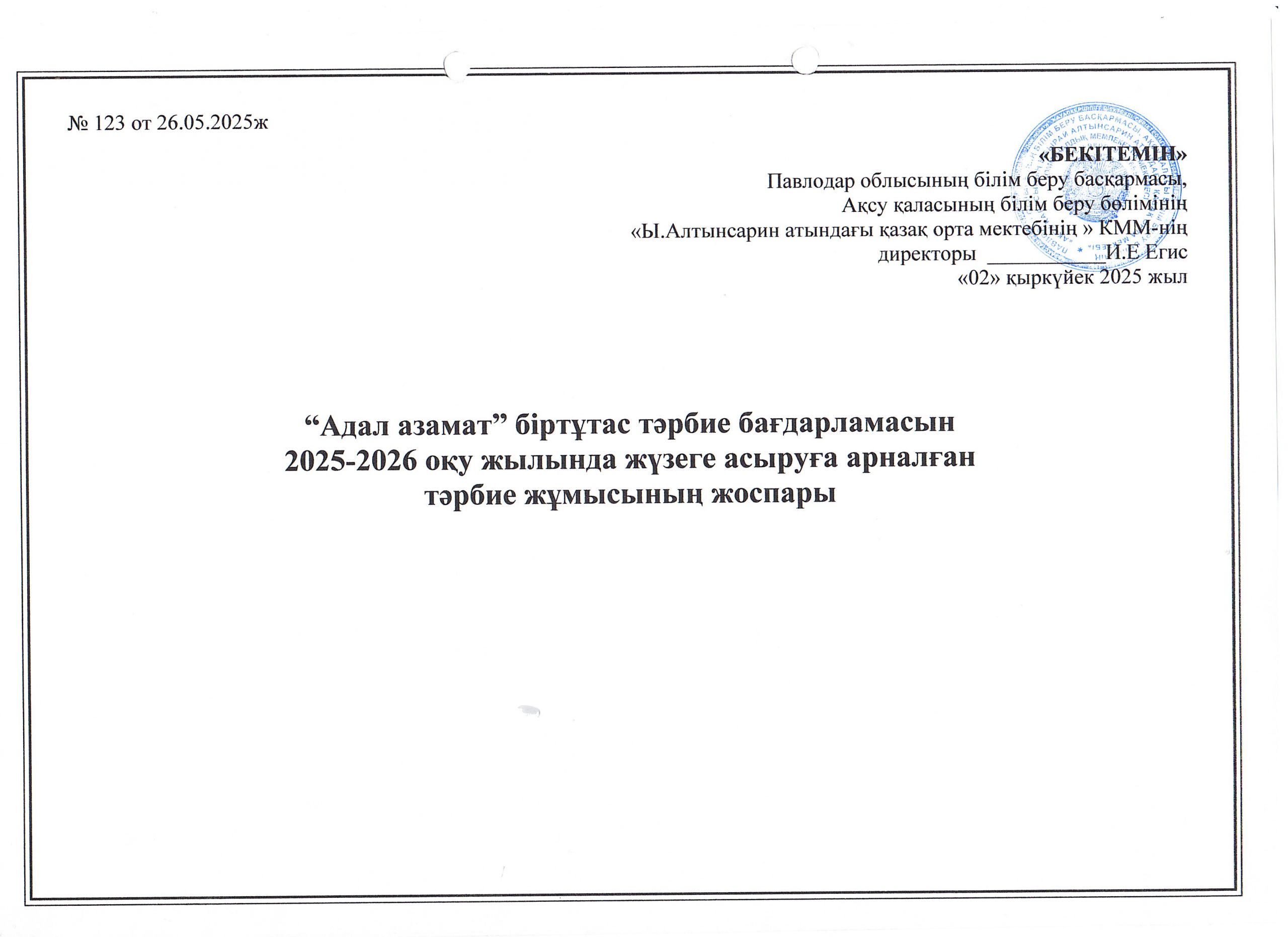 «Адал азамат» біртұтас тәрбие бағдарламасын 2025-2026 оқу жылында жүзеге асыруға арналған тәрбие жұмысының жоспары Posted on 27.02.202627.02.2026 By admin Тәрбие беру жұмысы 2025-2026 оқу жылына арналған тәрбие жұмысының жоспарыСкачать план ВР 2025-2026 Аксу рус.каз (1)Скачать